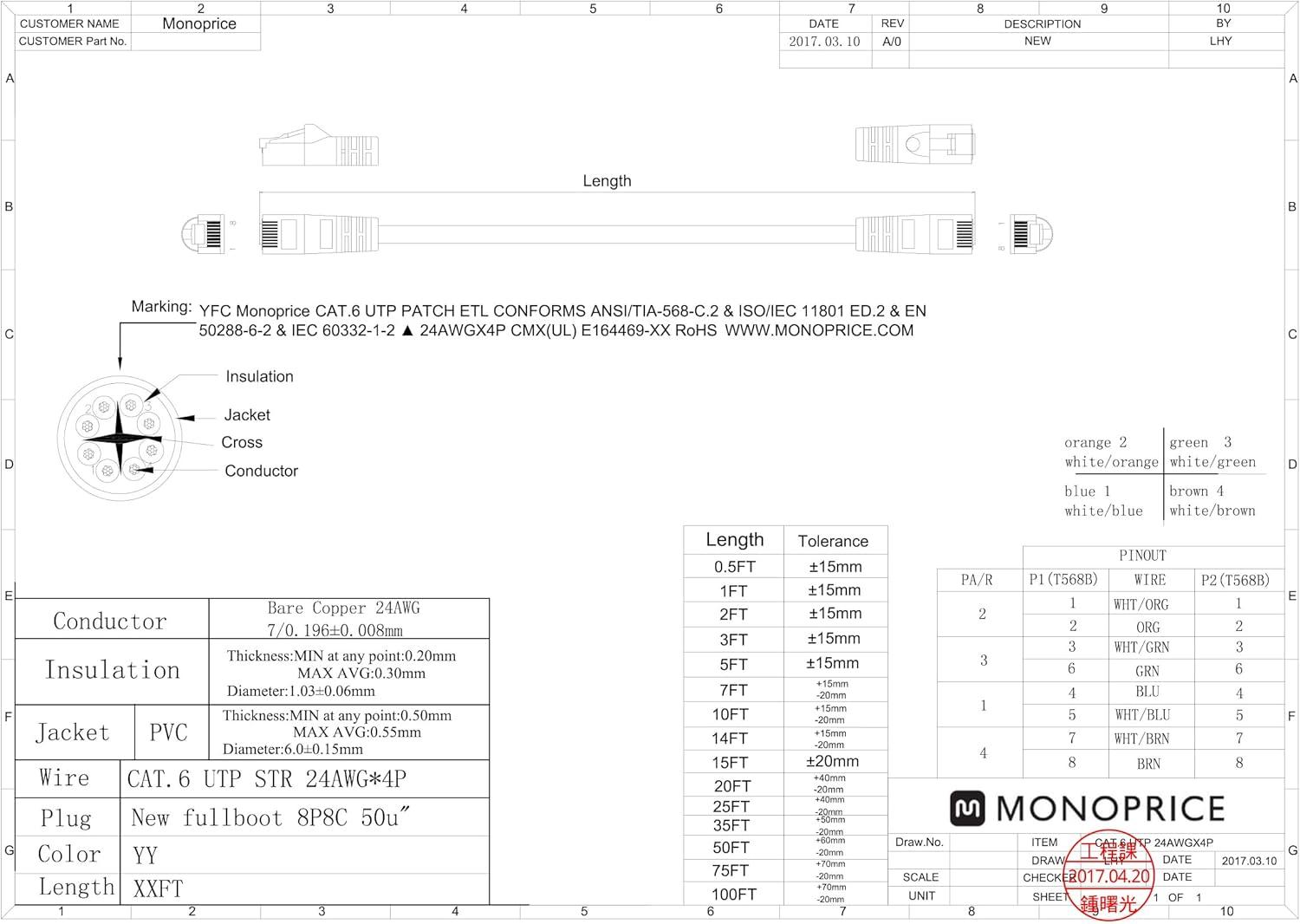 High quality Category 6 (CAT6) patch cables are the solution to your internetworking needs. With a blazing speed of up to 550MHz you can connect to your LAN/WAN segments and networking gear at maximum speed. Also with its superior connector you get a cable that is built for speed and endurance. Monoprice Cat5e and Cat6 cables are made of 24 AWG pure bare copper wire as opposed to copper clad aluminum (CCA) wire and are therefore fully compliant with UL Code 444 and National Electrical Code TIA-568-C. 2 fire and safety standards which require pure bare copper wire in Cat5e and Cat6 communications cables. .