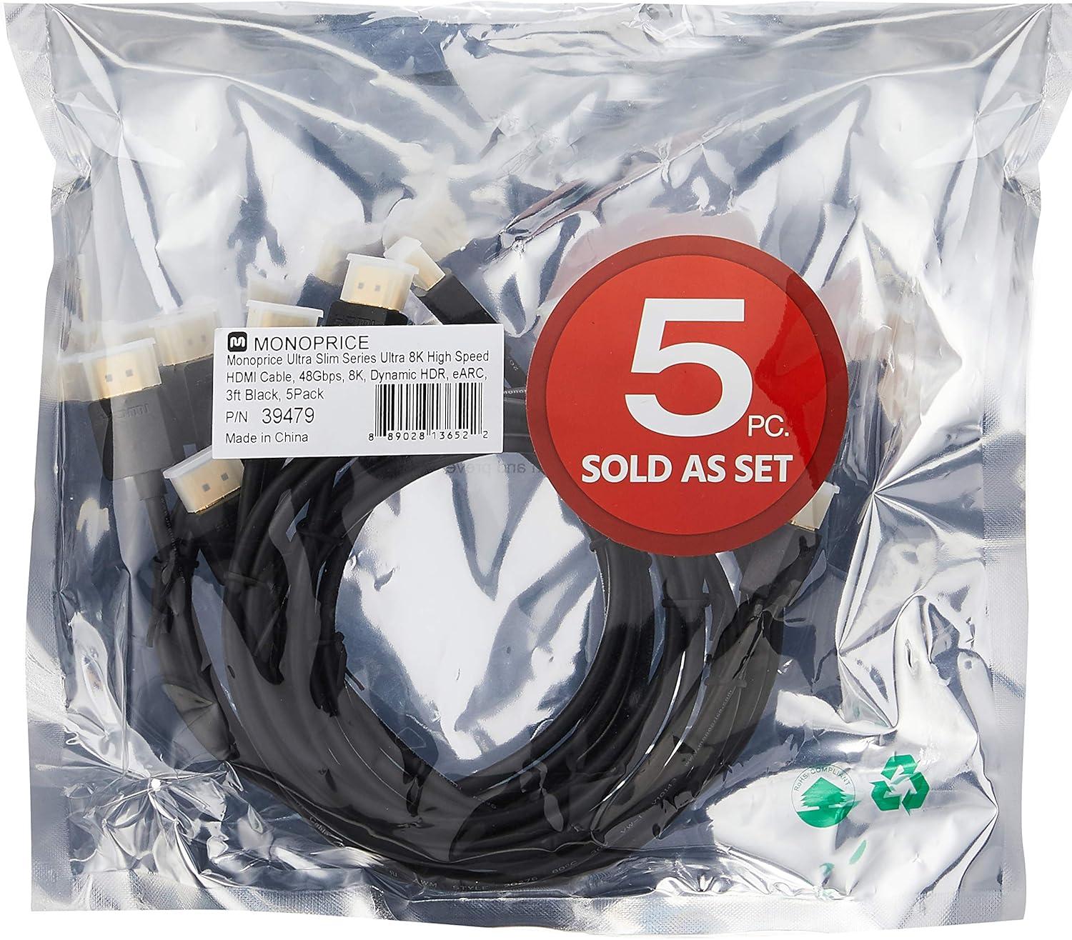 Monoprice 8K Ultra High Speed Slim HDMI Cable – HDMI 2.1, 8K@60Hz, 4K@120Hz, 48Gbps, HDR, VRR, 1ft, Black(5 Pack)