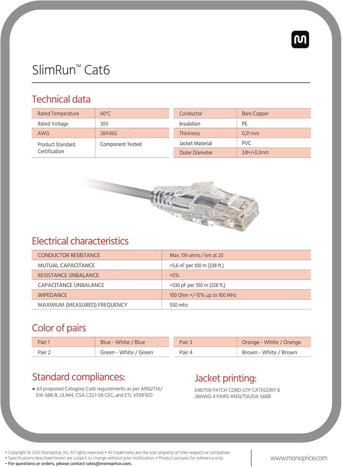Monoprice's SLIMRUN CAT6 UTP ETHERNET PATCH CABLES are designed for high density environments where space is a premium. SlimRun's ultra-slim 0.149-inch diameter 28AWG cable and narrow boot design reduces congestion and simplifies moves, additions, and changes. SlimRun Cat6 is component tested, which provides a better level of performance over channel-rated patch cables.