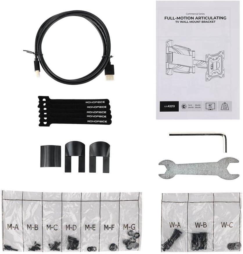 Convenient Set Of Essential Mounting Accessories: This Monoprice Commercial Series Full Motion Articulating TV Wall Mount Bracket includes a variety of screws, washers, and bushings to mount both curved and flat screen displays, as well as screws and anchors for mounting it to both wood stud and brick/concrete ceilings. We also include box and Allen wrenches for your convenience.