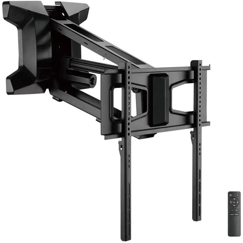 Many customers choose to mount their TV over a fireplace mantel due to the convenient and central room location. The Monoprice Motorized Above Fireplace Mantel Pull-Down TV Wall Mount offers a solid and affordable choice for over the mantel TV mounting options. Having the ability to pull the TV down and out for viewing and later retracting it back above the mantel when not in use provides a cleaner look and more efficient use of living space for the homeowner. A quiet motorized mechanism provides long life with smooth positioning and motion. Using the included remote, viewers can control the mounted TV from across the room.